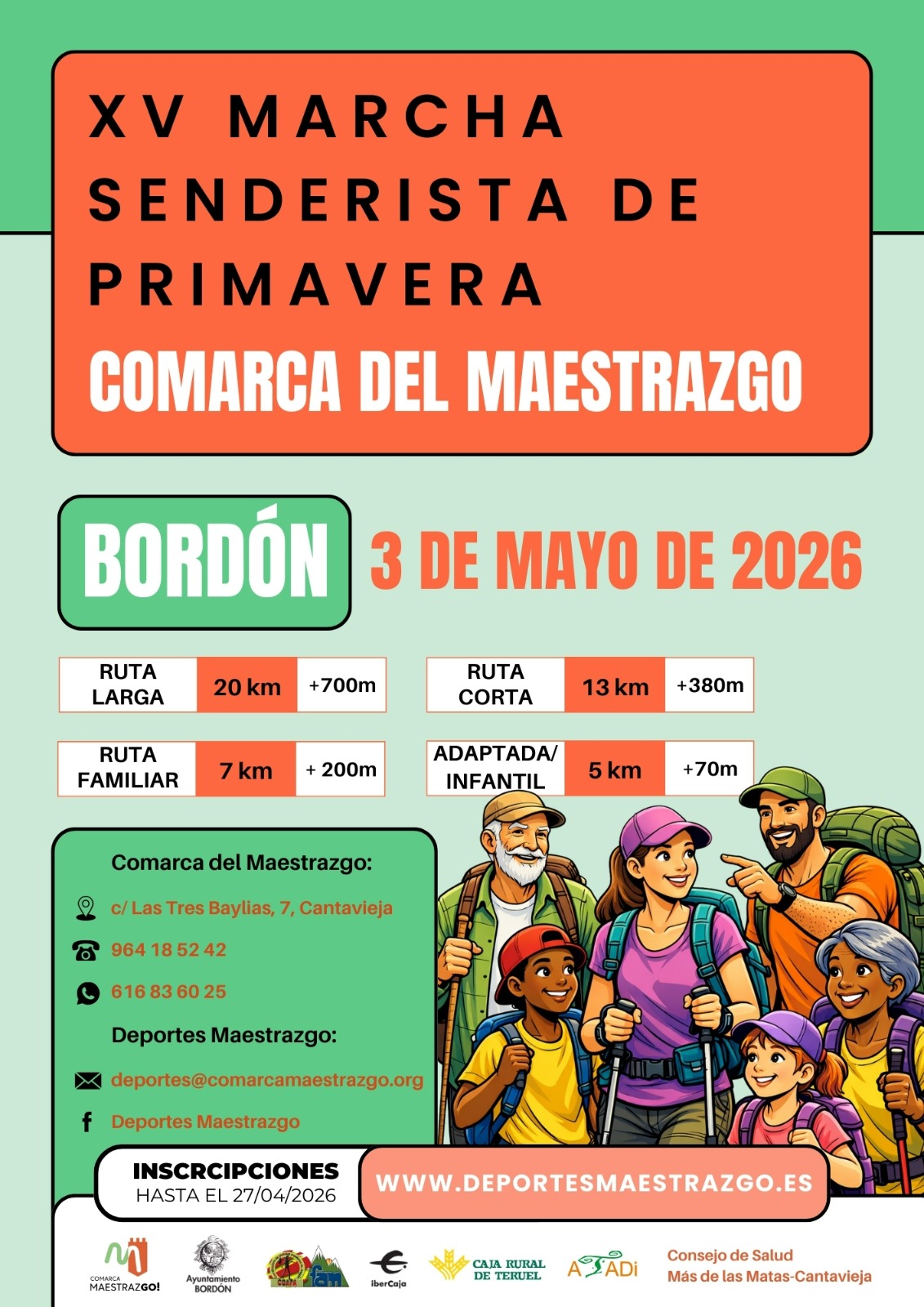 Localidad: Bordón Las inscripciones estarán abiertas hasta el 27 de abril de 2026, a través de la página web oficial: www.deportesmaestrazgo.es o del siguiente enlace: https://www.avaibooksports.com/inscripcion/xv-senderista-primavera-bordon-2026/inscripcion_datos/
